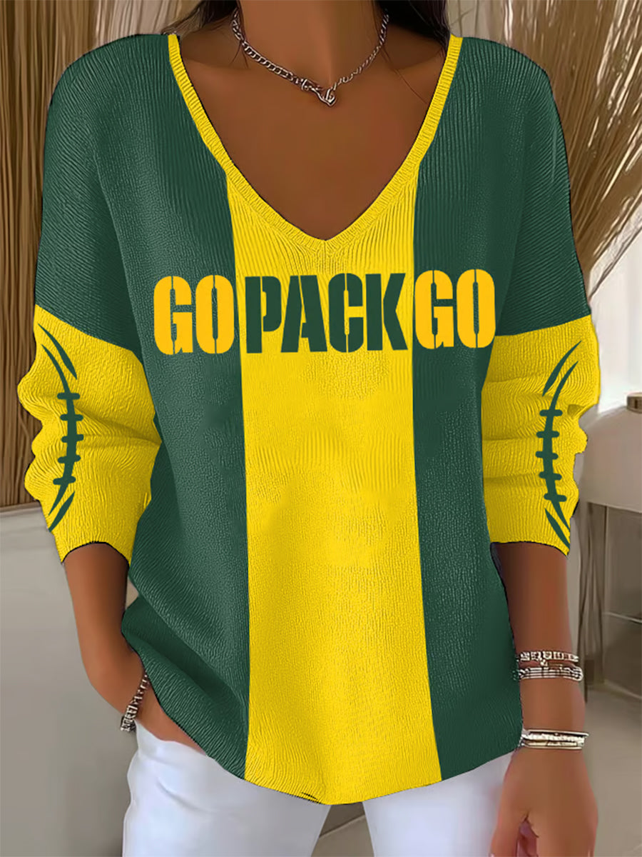 Women's Football V-Neck Ribbed Print Top