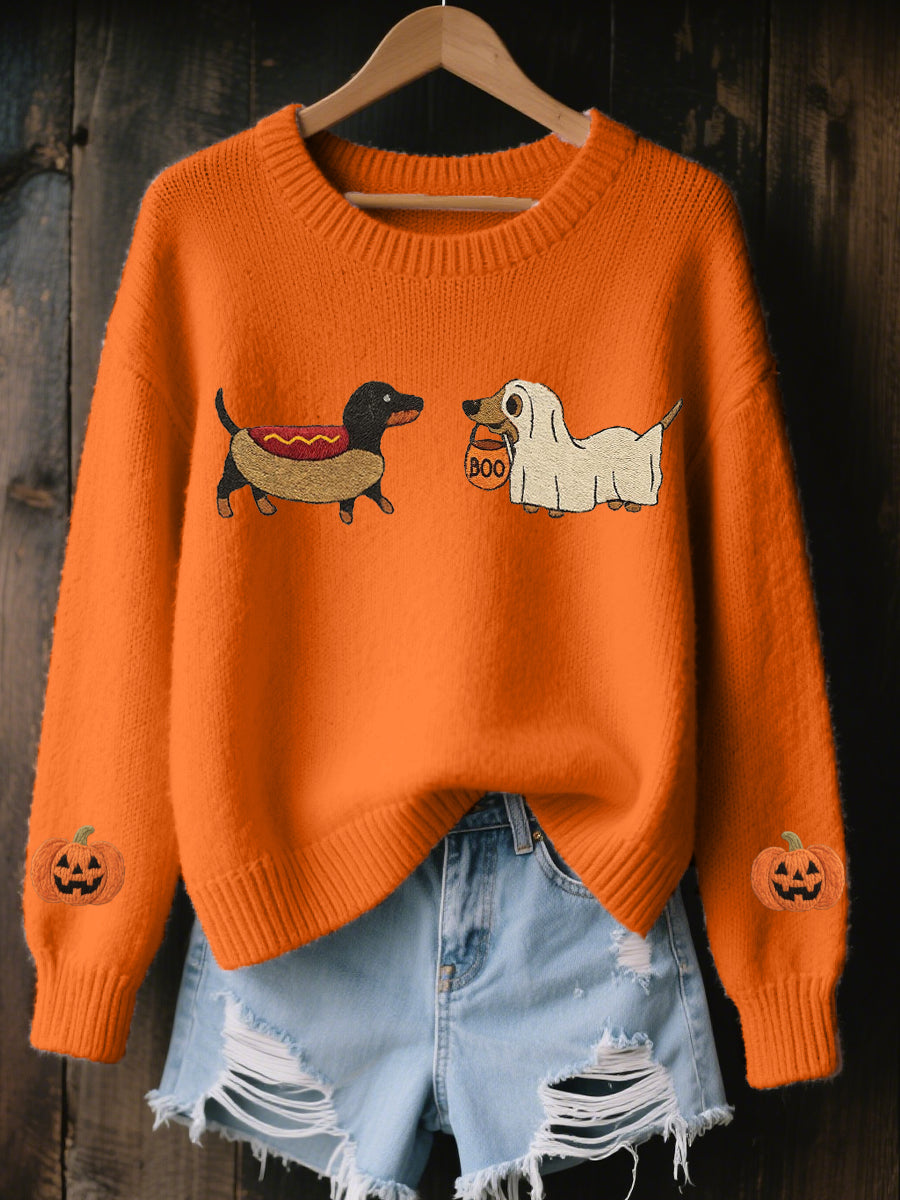 Women's Halloween Inspired Dachshund Embroidered Cozy Knit Sweater