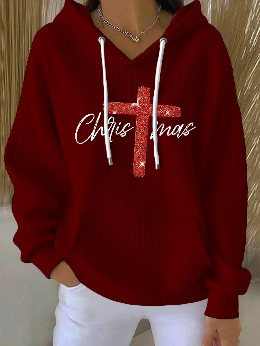 Women's Merry Christmas Cross Print Ribbed  Hoodie