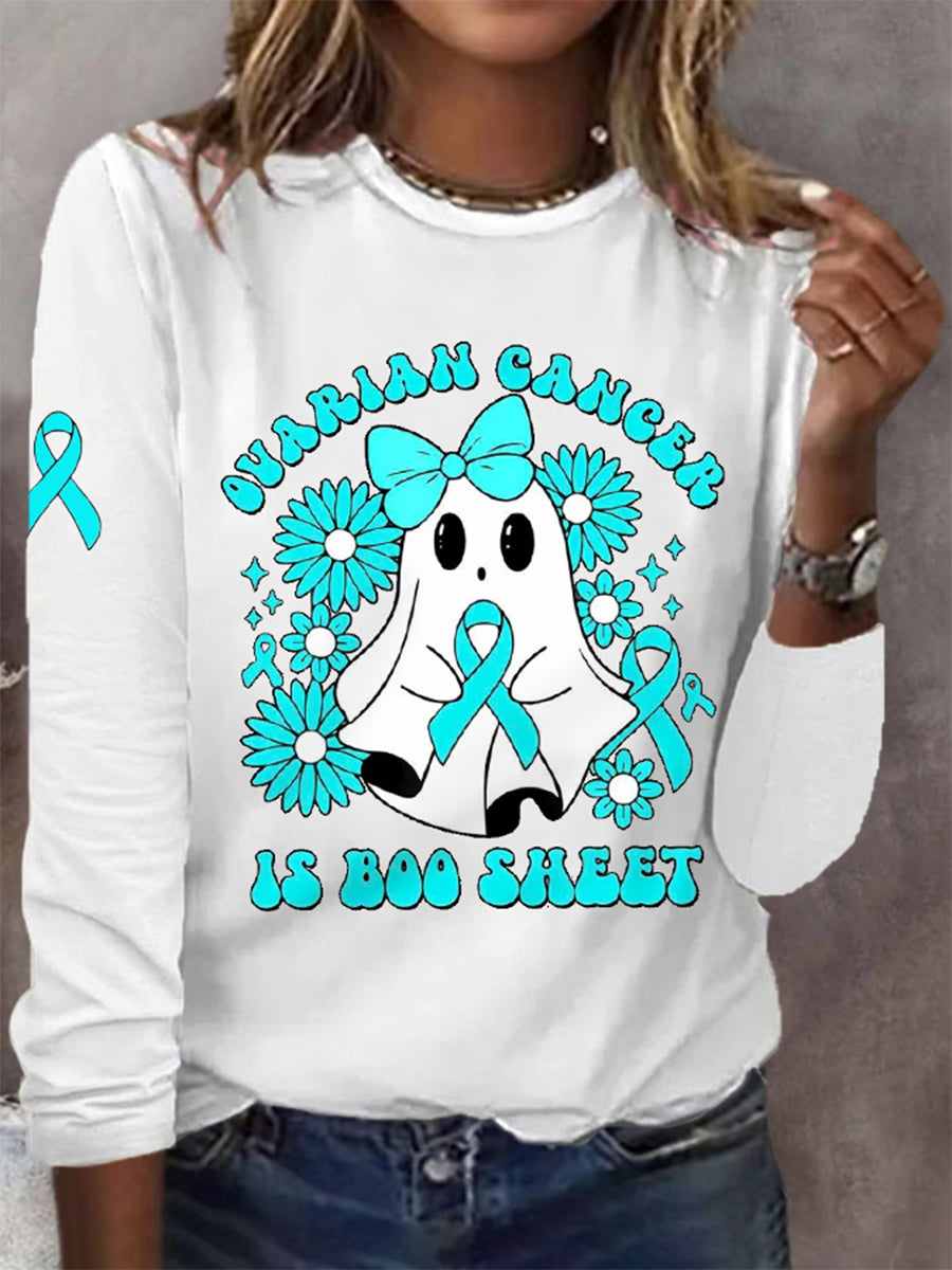 Women's Ovarian Cancer Is Boo Sheet Halloween Ghost Teal Ribbon Ovarian Cancer Awareness Long-Sleeve T-Shirt